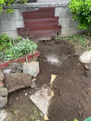 屏風?花壇の再構築を始めました。その1 ↑after↓before←5月上旬の様子です。5月上旬の様子です。この花壇の右手に仕込んであったスプレー咲きチューリップが殆ど咲かず、いや葉っぱも現れない状況は、間違いなく水捌けに起因してると思われ、その原因を探るべく再構築に臨みました。先ず仕切り材を外してゆきます。2年前の夏に廃材で囲んでた(リ