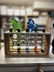 大昔に作ったハーバリウムです。100均で買った箱の底板を外して、100均で買ったレトロ感のあるガラス板をはめ、100均で買った試験管にそれぞれの色で統一したものを作りました。 たぶん5年くらい前なんですかね。よく覚えてないです。 この頃は穴を開ける道具がなくて、キリでたくさん細か