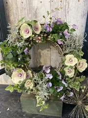 品があって素敵なリングリースの寄せ植えですね😊🍀👍 色合い好きな色です❤️