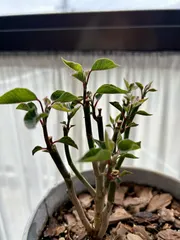 昨年のクリスマスの寄せ植え 昨年末のGWSで寄せ植えしたポインセチア、今こんな状態です。 3月頃に枝を短めにカット。普通に水やりして、窓際に置いておきました。先月あたりからの葉が出て来て、今は葉の長さ3センチくらいです。 今までは、年明け頃には枯らしてましたが、今回は上手く行ってます😆 一緒に植えたシ