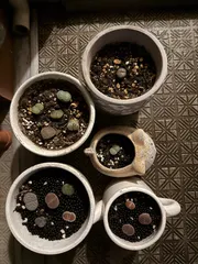 リトープス植え替え 色々な鉢に土も少しづつ変えて植え替えてみました一つだけ鉢穴が無い豚🐖さんにも 株分する時に少し根を痛めてしまったかも? 枯れないでしっかりと根付いてほしい
