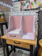今日は午後からホームの吉田店でワークショップ、2つめのレトロなブックスタンドを作ってきました。 前回は↓ブラックを基調にして作りましたが、今回はファンシーにライラックで作ってみました。とことんファンシーに仕上げることを目標にやってみたら、壁紙も含め、可愛らしい出来上がりになりました。柄の丸