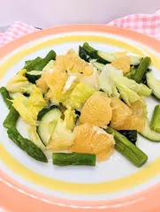 日向夏のグリーンサラダ ■材料 自家製アスパラ、きゅうり、レタス、日向夏 ■作り方 アスパラは茹でて、レタスは手でちぎり、きゅうりはカットしますドレッシングに日向夏を半分絞って入れ、残りは皮をむき、和えます ■工夫ポイント いつものサラダに日向夏を入れ、見た目も香りもさっぱり風味にしました