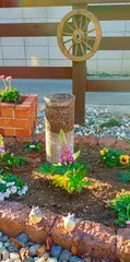 春に向けて花の庭作り 暖かくなってきたのでカインズで買った花で庭作りしてみました。ダイソーの100均グッズとカインズグッズで作った平板の上にも乗せてみました。セリアのアイアンフックにネットで2000円で買ったガーデンホイールを飾り付けてみました。