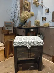 収納付きスツール 今日は収納付きスツールを作って来ました✨。先日縫っていたのは座面の開け閉めに使う紐部分でした😅。 友人が自宅に来た時に以前作った収納付きスツールを見て気に入ってくれたので、友人にプレゼント🎁しま〜す😊。