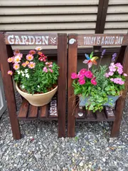 アレンジアワード2022【フラワースタンドと寄せ植え】 WSで作ったフラワースタンドとステンシルして、寄せ植えの鉢を置きました😊💕右はグリーンのWS左はmyアレンジ🍀