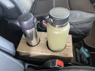 私、仕事の時はいつもお茶とコーヒーを保温ボトルで持参しておりますが、お茶のボトルが太くて愛車のドリンクホルダーに入りません😭そこで、入らないなら作ってしまえとばかりに、車の内装に似合わない手作り感満載のドリンクホルダーを作りました。これで運転中でも安心して水分補給ができます😅写真左側のボトルは標準サ