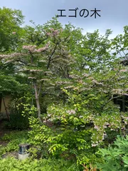 エゴの木の花が咲きました 普通は、白花が多いらしいですが、うちの子はピンクの濃い色で珍しいらしいです。お大きく成長しましたね。まるで、森の中に入って行くみたいになってますが、夏ならではの光景なんですよ。ここちらは自宅の庭になります。