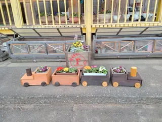 花の寄せ植え WSで作ったボックスプランターカバーと汽車型プランターカバーに、寄せ植えしました。