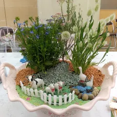 親子でミニチュアガーデン作り 本当は孫ちゃん連れて行くはずだったミニチュアガーデン作り、孫の母である娘が、体調不良とのことで、孫の連れ出し叶わず、ばーばが1人で、他は子供連れの親子が8組、先生2人が指導してくださいました。地域活性化の事業で、とてもお値打ちに作らせていただけました。対象の子供が年齢低すぎ、先生が急遽アヒルとヤギを