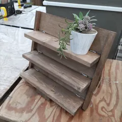 ディスプレイ棚 折り畳みディスプレイ棚づくりのワークショップに参加しました。 ぺちゃんこになるので、使わない時はコンパクトになります。マルシェなどにも活躍しそうです! 今までの作品に合わせて、ウォールナットカラーを刷毛で塗ったあと、ウエスで拭き取るやり方でアンティークな木目にしました。