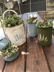 空き缶沢山あったので、リメイクして多肉寄せ植えしました。初のザラザラ塗装、ペンキに苦土石灰混ぜて汚し入れ、ステンシル。多肉入れ過ぎて、ゴチャに💦バランス難しいですね。
