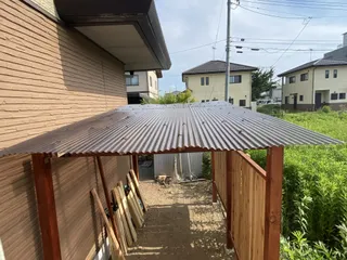娘の自転車小屋づくりシリーズ9 やっと屋根を取り付けました! ポリカーボネートです。9尺を3枚と6尺を3枚使いました。カインズで購入し、専用のビスで止めました。 大き過ぎたので、真ん中辺りを止めるのが届かなくて、一部止めてません笑 重なり部分は全て止めているので大丈夫かなと。 奥から壁ギリギ