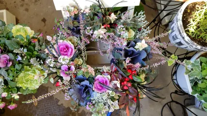 うわぁー😍 華やかで素敵ー✨✨ ギャザリングリースいいですねぇ👏👏 私もギャザリングやってみたいです😆 カルーナとかアリッサムも株分けしちゃうんですか? 濃いブルーの大きな花は葉ぼたんですか? 素敵な色ですね😍 このお花たちを選んだぷりぶりさんセンスいいです👍