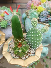 サボテンに動きが💕😍 ワークショップで作ったサボテンの寄植えのドラゴンフルーツの頭に子株らしき芽が出ました💕🥰 2月にカットした柱サボテンにも芽が💕楽しみ♥楽しみ♥