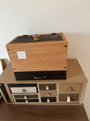 下の収納ケースはもともと🏠にあったものですが、そのテイストに合わせて作ってみました 引き出しに穴は開けずに取っ手をつけて、蓋は蝶番で固定しました マスクの箱がむき出しになっていましたが、隠すことができて良かった☺️