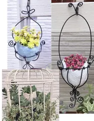 タマゴの殻鉢😄 殻は強度をつける為モルタル塗って乾いたらカインズさんのZARAZARAを塗りペイントしてあります。左下は100均で購入した220円の鳥籠(大)タマゴをそのままぶら下げたかったので黒いワイヤーで下げてます。