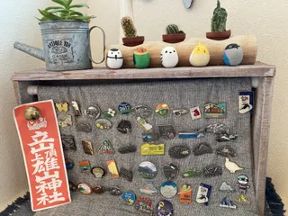 箱に100均で買ってきた伸縮棒と布を組み合わせて、バッジを飾ってみました😁