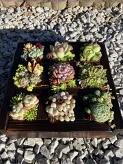 幕の内多肉弁当🍱 ■作品内容幕の内風に多肉を寄せ植えしました🍱 ■工夫ポイントお重をイメージしたので下の土が見えないように、セダムを詰め込みました😆木箱もお手製です💕※以下多肉ハック部門のみ入力■材料■工程