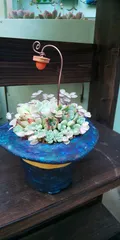 手作りしたシルクハット鉢に寄せ植えしました。本当はこれに植えたいTagさんに教えてもらったにょろにょろっぽい苗が欲しいと思いました。手にいれるのは、多肉店を回って出会えた時に買おうと思っているので、まだ時間がかかりそう。暑くて動けないにゃー。😸私の鉢の使い心地も知りたいし、使うことにしました。☺️鉢