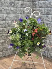 服部先生のビオラのハンギングバスケット💜🤍💛🔴🌿