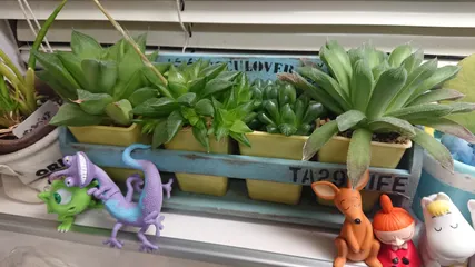 多肉の棚 (-ω- ?) 多肉の棚なんて呼んでもいいのか謎ですが💦(笑) 我が家の流し台の所にいる100均の小さな棚に色塗ってステンシルしただけの物 最近見なくなったDAISO多肉の鉢がちょうど4個シンデレラフィット✨ちなみに入ってる多肉もオブツーサ以外はDAISO多肉💖皿洗うついでにマメに水あげちゃうの