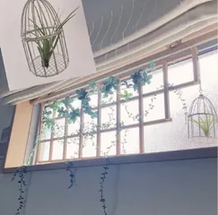西日が眩しい窓に100均の曇りガラスシートを貼ってます。だいぶ前に作ったので何センチの棒か忘れましたが😅長細い棒をカットして虫ピンとボンドでつけて飾り枠?を作ってフェイクグリーンを絡めて完成✨100均カゴにエアープランツを入れてぶら下げました。(今は冬なので窓辺は寒いからエアープランツは避難中)飽き