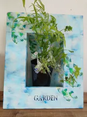わぁ〜😃素敵なガーデンフレームですね。 ミニサインボードとお揃いで、とっても爽やかです。私も近々ミニサインボードのWSに参加する予定があるのですが、WSでは塗装の技法も勉強できるのですね✨WSが一段と楽しみになりました😊🎶 ちなみに、葉っぱの模様は、ステンシルですか?それとも筆先で、描かれた感じでし