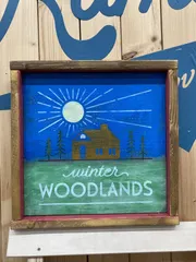 フレーム付ミニサインボード デザイン名冬の森林 本日、姫路大津店のWSでフレーム付ミニサインボートに参加して来ました。 何時ものプログラム作品と違い、最初は躊躇いました。 ・作品に着手する前の写真作業台に工具、ボード、色見本等工程中の写真は撮影出来無かったので