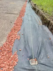 門から入って花壇側は溝があり水道を作った時に流れる溝があるのですが、風で運ばれた土がたまり草が生えるので防草シートと瓦チップを敷き、玄関までが長いので、毎回毎回の草むしりを軽減しました!