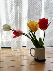 チューリップ🌷 昨日、千葉県佐倉市のチューリップ祭り🌷に行って、根付きのチューリップの掘り上げ(平日は13本で600円❣️)を体験してきました😊色んな種類があり、目移りしてしまいました。夏みたいに暑い中会場を歩きまわり、日焼けしました😅チューリップ暑さでちょっとグッタリ。一晩球根ごとバケツにドボンと浸けたら持ち直し