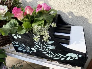 ピアノ型プランターカバー 初めてのジグソー、2回目のステンシルドキドキしたけれど手伝っていただきながら、なんとか完成しました。店頭に並んでいたかわいいジュリアンを早速寄せ植えしました。大好きなピアノとお花、毎日眺めてニヤついてしまいそうです!