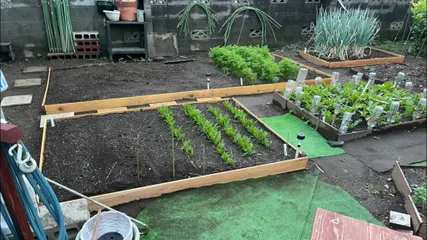レイズドヘッド用板材の入れ替え 第七弾 コレまでの経過は最後にリンク貼りました。家庭菜園全体図です。⑦は右下の所です。板材(野地板)の電気カンナ掛け、サンダー掛け、塗装を事前に施してから作業に移ります。(その様子は第一弾、第二弾のリンクをご覧下さい。)以下、作業手順です。作業前の様子です。古い板材を外して新しい板材を貼れる準備をします。こ