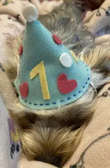 今日は、我が家のヨークシャーテリア、1歳のお誕生日🎂何か記念に残る事をしたいと思い、わんクォールさんに掲載されてた【とんがりハット】を参考に、急いで手作りしました💦 ご馳走を食べる時以外は、嫌がってすぐに外そうとするので、なかなか良い写真📸が撮れず…😭 元気にスクスク育ってくれて