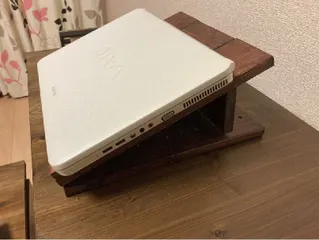 パソコンラック お店でパソコンラックを見て「作れるかな?」と思って1×4材で作ってみました。 本体に「ダボ穴」をあけ、端材にダボを付けて「角度調整」出来る様にしました。木材は「ビス」は使わずに「波釘」を使って固定してみました。色は100均の「ウォルナット」を使ってみました。前作が「熱がこもる」感じだったの