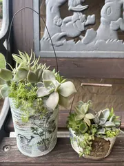 地元のカフェで、今回はリメ缶作って多肉の寄せ植えのワークショップに参加しました☺️ 缶を潰して穴開けて、ザラザラベースを塗ってから塗装。その後デコパージュしました🥫その後多肉を植えるのですが、午後から予定あり、帰ってから自分で植えてみました😓いや、植えるというよりただ乗せてあるだけです😥や