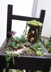 多肉寄せ植え 昨日のオモチャの水車に色塗りしました。https://diy-square.cainz.com/chats/room6qrgxagryl0x 今日は、チェア型グリーンスダンドに鉢底ネットをしいてベラボンを敷き詰めて、その上に多肉の土を入れて見ました。良いかどうかわかりません。😁