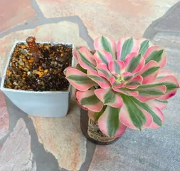 ピンクウィッチ カットその後🎶 先日(10月22日)ピンクウィッチを思い切ってカットした投稿をしたその後…小ちゃな赤ちゃんがぷつぷつと出てきました〜🎶カワイイ〜🥰❤️❤️10日ほどで出てきましたよ✨✨ 頭の方はさくらさんのかっちょいいリメ缶に植えました❣️ピンクウィッチのピンクとリメ缶の焦茶がよく似合うっ😆❤️