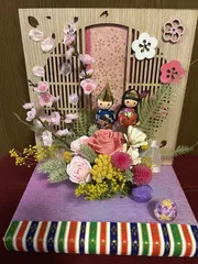ドライフラワーでひな祭り🎎アレンジ 台に和紙を張り、後ろの円窓に和紙を張ることから始まりました。台の真ん中あたりに小さいオアシスをUピンで押さえて固定(台の素材は発泡スチロール)オアシスにバラ🌹ソープフラワー、リボン、プチフラワー、千日紅、ボアプランツ、カスミソウを順々に差し込んで根元にモスを付け✋🏻✋🏻✋🏻円窓に梅のパーツ🌺を付けま