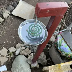 時期はずれかもしれませんが、日中でも虫が飛んでる時には必須です。ステン皿は100均、支柱部分は垂木材です。ただ、屋外なので近くで作業してないと効果は感じませんが、皿部分は外して移動可能です。