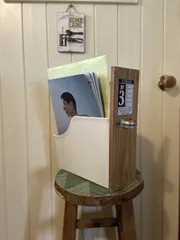 100均のプラスチックのラックに木を付けて、取っ手を付けて、デコしたら前から見たらお洒落な書類ラック完成です^_^