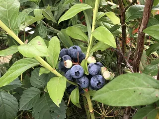 庭のブルーベリー🫐が色づいてきました。そろそろ収穫できるのかな?いつも鳥に食べられて何個かしか食べてないのでよくわかりません。今年は春に網掛けしたので実が残ってます! 朝採りがいいらしいので5時起きして収穫♪あれれ?葉っぱが網になってる?虫に食べられたのかな。消毒する必要がないしあまり良く