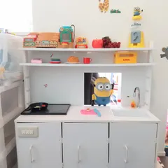 カラーボックスをおままごとキッチンとしてリメイクしました!!これが私のDIY初作品で度々改造をくり返しています!!IHは100均のフォトフレームとスチレンボード水道は黒ビニールテープでセンサー式水道を表現しました!!シンクはくり貫いて小物入れをはめ込みました。私の一番のお気に入りは扉にあるスイッチで