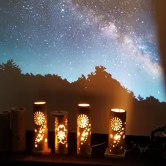竹あかり 7日の七夕に竹あかりのWSに行ってきました😊💕今回は、桜にしたので、穴あけが多くて大変でした💦とっても楽しかったです🎶前回の竹あかりと並べて点灯