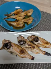 ちっこいノドクロの煮付けと塩焼き 秩父の帰りお気に入りのスーパーへ✨8匹入って235円❤️小さいのは煮付けに、大き目なのは塩焼きにしました👍😍