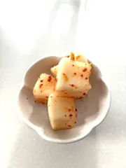 カクテキ 大根が安くなっていたので2本買ってカクテキ作りました😄荒めの唐辛子🌶️しかなかったので少し薄めに出来上がりました。今回はお好み焼きなどに入れる干切りイカを少しだけフライパンで炒ってみました。袋に材料の調味料を全部入れて軽く塩漬けし大根をモミモミ。