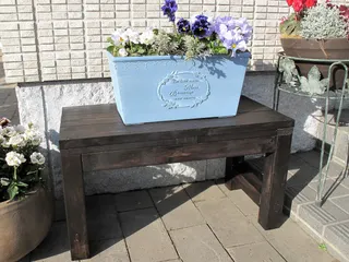 ミニベンチ ロング 初めてチャレンジ 前橋 吉岡店て行われたミニベンチづくりに初めてチャレンジ、さっそく自宅に持ち帰り花の鉢をおきました。素人にしてはまずまずの出来栄えでした( ^)o(^ )