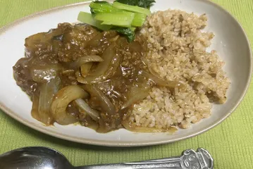 キーマカレー ひき肉がお値打ちだったのでキーマカレーに普段は玉ねぎしか入れないけど今回ナスをいれました😊玄米のレトルトがあったのでいれたら茶色だらけ😅青梗菜を入れて料理、盛り付けセンスがないで😅 食べる準備をしてたらさっきまで寝てたのに、こっちのご飯は?の目線が準備します😆