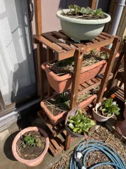 イチゴ畑解体→プランター栽培へ移行 家庭菜園に三角形に配置してたイチゴ畑(リンク→ https://diy-square.cainz.com/announcements/kkx93hc9kpgq30t6 )を解体して、プランター栽培へ移行しました。イチゴの係は母ですが、膝が曲がらないのもあって、畑での世話は厳しいと判断して。作業中のシ
