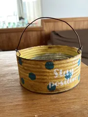 リメイク缶 先日ブッタ切った業務用のトマト缶のリメイク缶が完成しました😊粉ふるいと大きさ比較ワイヤーで取っ手をつけるの苦手💦リバーシブルに💕最近お気に入りのターナーミルクペイントのミモザイエローとターコイズブルーでキュートな水玉ちゃんに😍 裏面にもステンシルして両面から使えるように❣️ はい